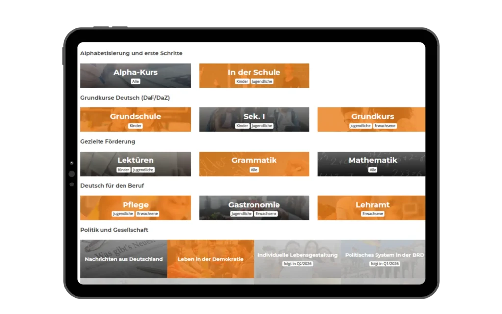 Den Lernenden stehen digitale und analoge Lerninhalte von der Alphabetisierung bis zum B2-Niveau zur Verfügung, abgestimmt auf Schulform und Alter. Über 2000 aufeinander aufbauende Lektionen sowie Videos, Audios und interaktive Übungen orientieren sich an den Lebenswelten der Lerngruppen und sorgen für eine klare Progression im Wortschatz und im Sprachniveau.