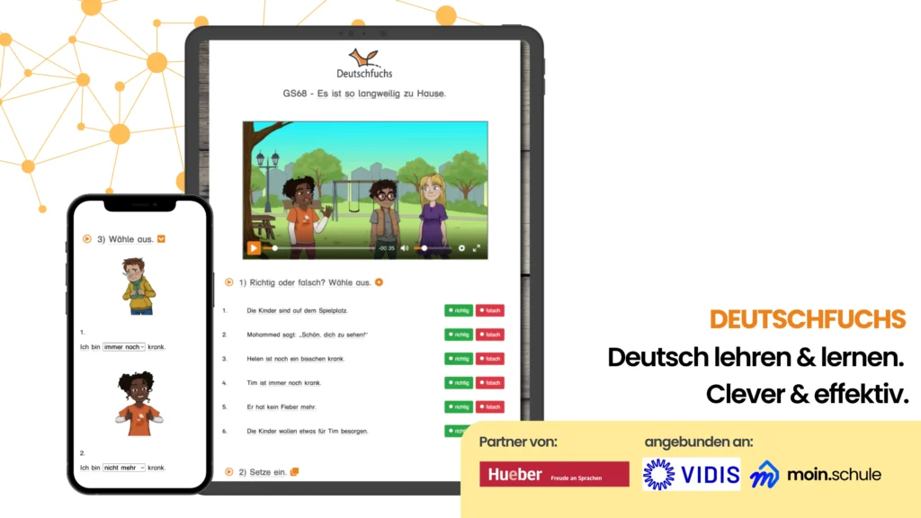 Deutschfuchs kooperiert mit dem Hueber Verlag und erweitert das Angebot digital mit einem riesigen Schatz an Zusatzaufgaben im digitalen Format. Das Bundesministerium für Bildung und Forschung sowie das Landesinstitut für Schulqualität und Lehrerbildung Sachsen-Anhalt empfehlen Deutschfuchs für den Einsatz im DaZ-Unterricht.